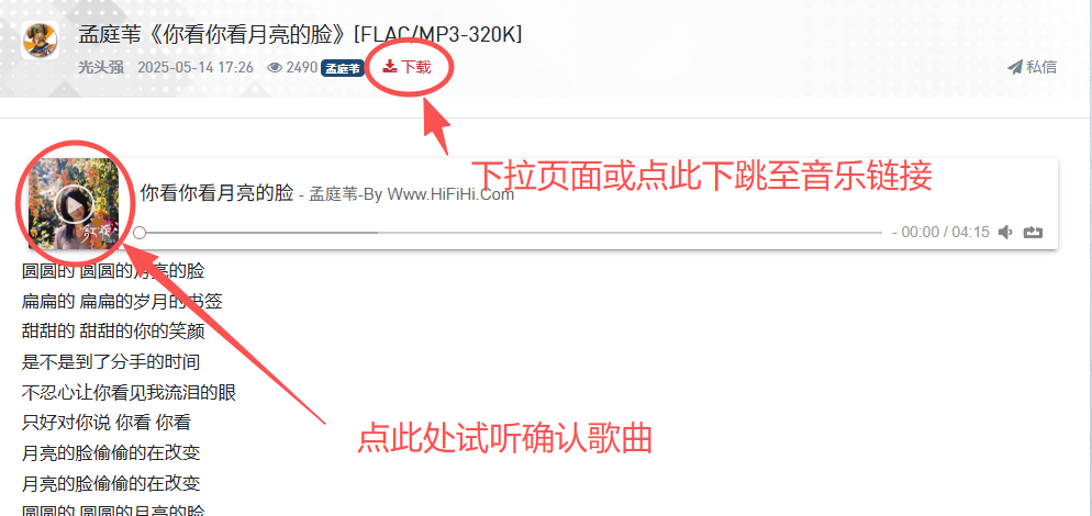 3、找到自己中意的歌曲,点开内页试听,下拉或点"下载"跳转至下载链接